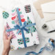 Blue, red and pink Christmas tree pattern wrapping paper.