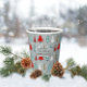 This paper holiday cup features an offset pattern of Christmas trees of all different styles and modern colors of red, turquoise, slate blue and soft yellow. A template is provided for you to add your own favorite holiday greeting, name and/or other text. Search ID175 to see other products with this design.