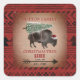 Christmas tree farm ranch themed illustration of a buffalo wearing a santa hat with a snow covered Christmas tree tied to its back. Snow speckle and cardstock inspired background with arrow design and geometric border.