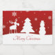 Modern minimalist simple Christmas illustration featuring white silhouettes of reindeer, tree, snowman and snowflakes with Merry Christmas greeting on a red background.
