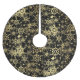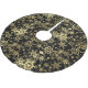 This Christmas tree skirt is shown in a pretty black and gold festive holiday snowflake print design.