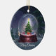 A large snow globe with a festive red base containing a decorated Christmas tree with a bright yellow star on top and colorful presents sits in a snowy forest at night with a full moon in the background.