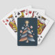 This card deck features a digital illustration of a modern Christmas tree design on a navy blue background. The tree is constructed from layered geometric shapes in a gradient of copper and silver colors, creating an angular silhouette. At the top of the tree sits a golden star with radiating points, emitting a warm glow. Surrounding the tree are decorative baubles in metallic copper, silver and rose gold colors, each with a small silver rim at the top. The baubles are arranged asymmetrically around the tree, with some larger baubles positioned higher in the frame and others lower. The card deck contains 52 playing cards and 2 Jokers. The cards are easy to shuffle. The cardstock is smooth.