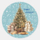 This vintage style sticker has a beautifully decorated Christmas tree with a star on top. At the base are stacks of elegantly wrapped gifts, a