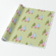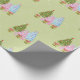 Christmas Tree wrapping paper with a green, blue and a pink tree, decorated, three green presents, and faux snow falling. Thanks to the Hungryjpeg for some of the elements in the design.