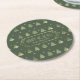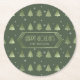 This paper coaster design features a pattern of stylized Christmas trees and snowflakes in light green on a darker moss green background. Optional 'Happy Holidays' text and a label have been provided to add your name and/or other text. Search ID861 thru ID864 to see additional color options and other products in this modern, Christmas design set.