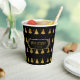 This paper cup features a pattern of stylized Christmas trees and snowflakes in shades of gold on a black background. Optional 'Happy Holidays' text and a label have been provided to add your name and/or other text. Search ID861 thru ID864 to see additional color options and other products in this modern, Christmas design set.