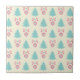 A ceramic tile with a festive christmas pattern on a cream colored background. Illustrations of pastel colored, greenish-blue, christmas trees and pastel pink baubles and bows in a repeating pattern.