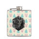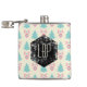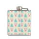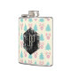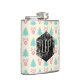 A monogrammed flask with a festive christmas pattern on a cream colored background. Illustrations of pastel colored, greenish-blue, christmas trees and pastel pink baubles and bows in a repeating pattern. In the center is a grunge style hexagonal shape with your personalized monogram initials.