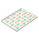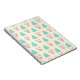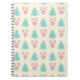 A notebook with a festive christmas pattern on a cream colored background. Illustrations of pastel colored, greenish-blue, christmas trees and pastel pink baubles and bows in a repeating pattern.