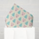 Tissue paper with a festive christmas pattern on a cream colored background. Illustrations of pastel colored, greenish-blue, christmas trees and pastel pink baubles and bows in a repeating pattern.