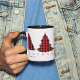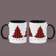 This design features a Christmas holiday cute trees custom, a winter whimsical festive merry, a merry Christmas simple typography, a winter buffalo plaid check checkered, a fun customized Christmas holiday gift, a Christmas drinkware coffee tea mug, with a minimalist minimal simple lettering, a modern style contemporary font text, a Christmas holiday red and black, simple holiday plaid pattern