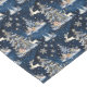 Tablecloth in a festive Christmas-themed toile pattern of Christmas trees, reindeer and snowflakes, against a dark blue, starry background