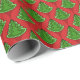 Vibrant, colorful green Christmas tree shapes on brilliant red wrapping paper.