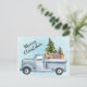 A postcard with a festive Christmas design. A watercolor truck carrying Christmas pine trees along with some woodland animals. A bear a fox and a deer standing in the back going for a ride.