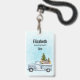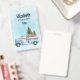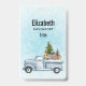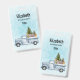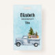 Personalized name tag with a festive holiday design. A truck carrying Christmas pine trees along with some woodland animals. A bear a fox and a deer standing in the back going for a ride. Design created with watercolors.