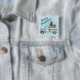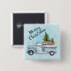 Button with a festive holiday design. A truck carrying Christmas pine trees along with some woodland animals. A bear a fox and a deer standing in the back going for a ride. Design created with watercolors.