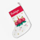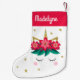 This personalized Christmas stocking features a festive unicorn face design with flowers, berries, stars and faux gold glitter. Personalize it with a name.