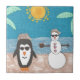 A snowman and a penguin take a vacation to the beach.
