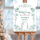 Christmas Wedding Ceremony sign with frame of wavy doodled ribbons, bows and festive elements including bells and candy canes. The sign is lettered with "wedding ceremony" in romantic calligraphy with a direction arrow (which you can flip in the design tool if you wish) and a sketched arched gazebo. The sign can be personalized with the name of the bride and groom and you are welcome to change the green color to any other color to suit your event decor. Please browse our wedding direction signs collection for alternative designs.