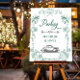 Christmas Wedding parking sign with frame of wavy doodled ribbons, bows and festive elements including bells and candy canes. The sign is lettered with "parking" in romantic calligraphy with a direction arrow (which you can flip in the design tool if you wish) and a sketched wedding car. The sign can be personalized with the name of the bride and groom and you are welcome to change the green color to any other color to suit your event decor. Please browse our wedding direction signs collection for alternative designs.