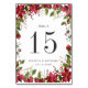 Chic floral table number cards feature a frame of watercolor red flowers, roses and poinsettia, framing your table number in white. Personalize with your names and wedding date, or name each table for an extra personal touch.