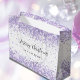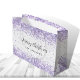 A stylish whitebackground decorated with violet, lavender colored faux confetti, sparkles. Personalize and add your family name. Text: Merry Christmas.