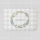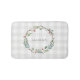 Custom-designed bath mat for the holidays featuring watercolor Christmas wreath design on rustic modern farmhouse buffalo check pattern.