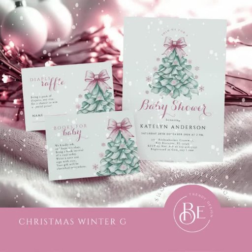 Celebrate the arrival of your little girl with this charming winter-themed baby shower welcome sign. Featuring a teal Christmas tree adorned with a delicate blush pink bow and surrounded by pastel snowflakes, this elegant design blends festive charm with a soft, coquette touch. Perfect for creating a memorable winter baby shower with a whimsical, yet sophisticated, feel.
