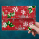 Christmas themed envelope design featuring white snowflakes and winter greenery, red berries on a red plaid background.