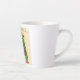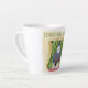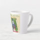 Latte mug with a whimsical watercolor painting. A young child in pajamas and her pet kitty cat looking outside their window on Christmas Eve. Santa Claus and his reindeer flying across the night sky in silhouette form with a big full moon illuminating their path.