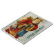 Christmas wishes in green font. A vintage image of the classic Father Christmas wearing his warm red coat and carrying a bag full of toys. This old-fashioned Santa Claus also known as jolly old Saint Nick is slim and holds a walking stick for travelling throughout the land gifting toys to all the little girls and boys. The background is an old and faded vintage parisian advertisement parchment with a shabby weathered look to it.