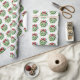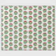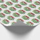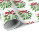 Holiday gift wrapping paper is shown in a festive Christmas mistletoe and snowflakes print.