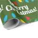A festive christmas warpping paper with Christmas lights and a Merry Christmas writing pattern. The cusive writing is bold and therefore eyecatching.