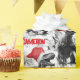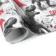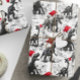 Personalized Christmas design features dinosaurs in monochrome wearing bright red Santa hats. It allows to you add a name to the design in a repeating pattern.