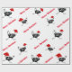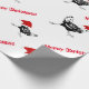 Christmas wrapping paper is shown with a fun group of black and white chickens running around wearing [in one way or another] red Santa hats. Printed on over white background.