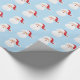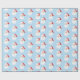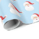 Holiday gift wrapping paper shown in a light blue background color with a festive Christmas Santa print.