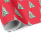 Holiday gift wrapping paper shown in a red background color with a festive Christmas tree print.