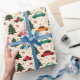 Brightly decorated wrapping paper features vibrant trees, colorful cars, and snowflakes, creating a joyful holiday atmosphere perfect for gift-giving this season.