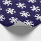 Christmas wrapping paper with a pattern of big white snowflakes on a dark blue background.