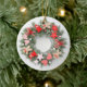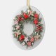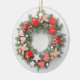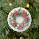 A festive Christmas ornament features a circular wreath made of green pine needles, adorned with various holiday-themed decorations. Among these are gingerbread men with white icing accents, red and white striped candy canes tied with red bows, and an assortment of red and white patterned stars, hearts, and Christmas trees. Small, round ornaments in white, pink, and red are scattered throughout the wreath, adding to the decorative effect. The wreath is set against a white circular background, and a gold string is attached at the top for hanging. The overall style is cheerful and whimsical, evoking the spirit of the holiday season.