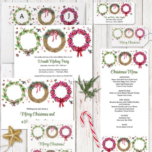 Send friends and family your best with these crafty Christmas stickers. Three different holiday wreaths are displayed with a variety of objects used in the craft of wreath making are scattered next to them. Perfect for your crafty Christmas to use as envelope seals, gift stickers, as simple thank you stickers, or on favors! Available with matching products.
