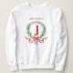 This Christmas sweatshirt has a preppy grandmillennial design featuring a Christmas wreath with a monogram letter in the center. You can personalize with your initial and name.