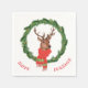 These festive Christmas themed paper napkins will dress up any Holiday party! They feature a watercolor image of a reindeer wearing a bright red and green scarf. The reindeer is framed by a green Holiday wreath. Your custom text is in red in two text fields at the bottom. The image and text are placed on a white background. Be sure to see the matching products in our store.
