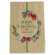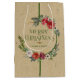 Colorful Christmas floral wreath, modern typography-Merry Christmas-, and beige cardboard paper texture background. Dark-red and green accent.