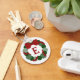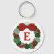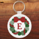 This festive geometric Christmas wreath keychain features a customizable monogram. The wreath in the original digital design is made of green dots in three different shades and sizes. A strand of smaller red dots reminiscent of cranberries winds around the circular pattern. The wreath is topped with a red bow.