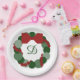Add a special touch to your Christmas festivities with paper plates featuring a geometric Christmas wreath with a customizable monogram in the center. The wreath in this original digital design is made of green dots in three different shades and sizes. A strand of smaller red dots reminiscent of cranberries winds around the circular pattern. The image is topped with a red bow.
