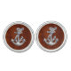 A chrome like nautical style applique on a rich mahogany wood grain print decor. A custom nautical style set of cufflinks for all festive occasions, on or off the boat.
