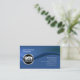 This simple elegant and professional photographer business card features a blue background. A blue hued wave streams from the left to the right, splitting the card into two sections. A circular chrome camera icon sits on this wave, on the left side of the card, while your name and title appear on the upper left and your business name and contact details appear on the bottom right. Designed for camera, photo, photographer, digital imaging, digital editing, film themes.