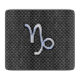 A chrome like Capricorn zodiac sign on a carbon fiber style design texture print background. A modern urban racy design for a great custom birthday gift idea.